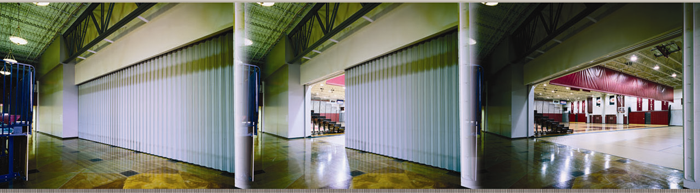 The Won-Door DuraSound acoustic accordion door provides flexible space division, allowing rooms to be quickly separated into multiple compartments.